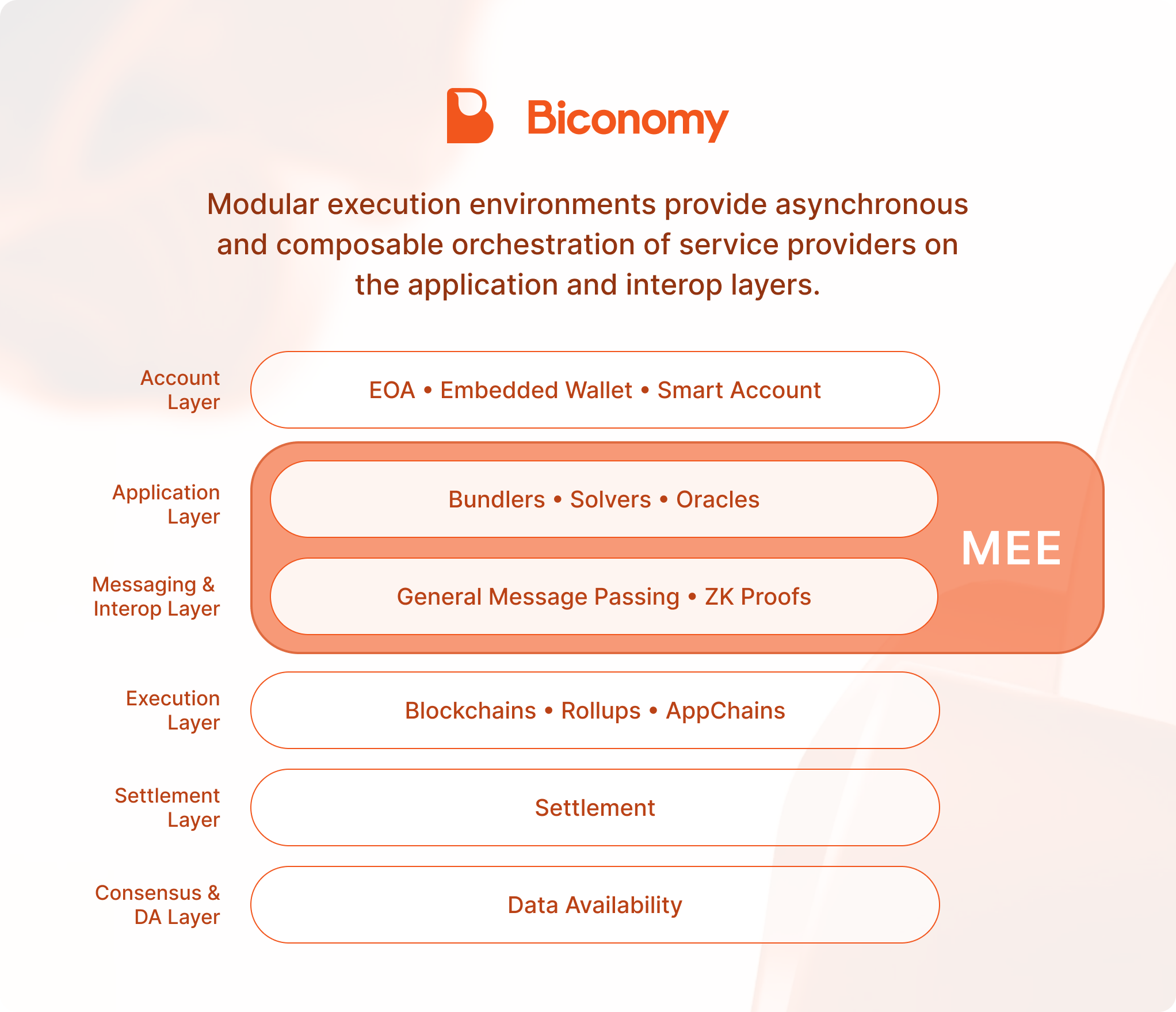 MEEs represent a natural evolution of the modular blockchain thesis, expanding the concept of specialized layers beyond consensus, data availability, and settlement. While the modular blockchain paradigm separated these core functions to optimize for scalability and efficiency, MEEs specifically address the execution layer by abstracting it away from the underlying chains. This approach allows blockchain interactions to be processed, enhanced, and optimized through dedicated infrastructure before reaching consensus layers, creating a specialized middleware that can handle complex transaction patterns, cross-chain operations, and user experience improvements uniformly across disparate networks.