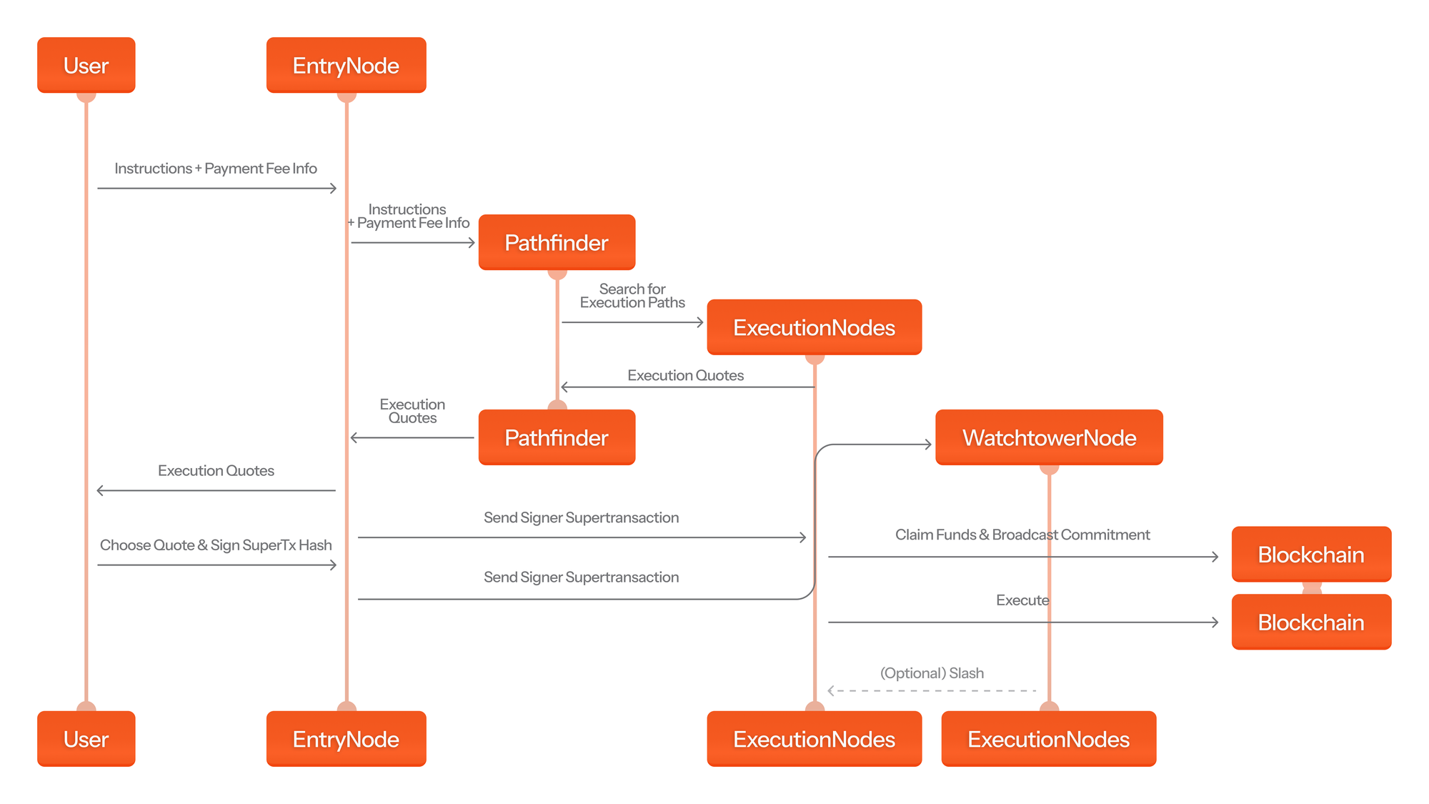 The user will accept one of the offered paths returned by the Pathfinder. Since the payment data is represented within each path, the Supertransaction Hash of each available path is completely different. The user permits the execution for a selected path by signing the Supertransaction hash of that path with their private key and sending the signed hash, along with the full Supertransaction instructions and payment object - back to the Pathfinder / EntryNode. The Pathfinder / EntryNode will then distribute the signed object to the executing nodes for execution and to the Watchtower node to slash the executing nodes if they offend.